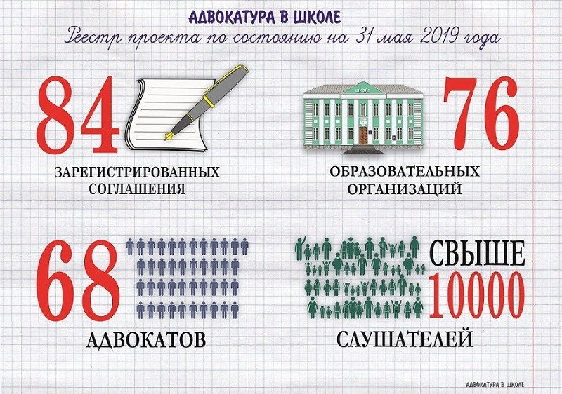 По состоянию на 31 мая 2019 года в реестре проекта зарегистрировано 84 соглашения о взаимодействии в сфере правового просвещения, участниками проекта стали 68 адвокатов, осуществляющих деятельность в 76 подшефных образовательных организациях Ростовской области. Программа правового просвещения охватывает свыше 10 000 слушателей.