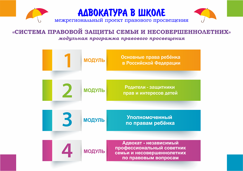 В 2018 году разработана модульная программа правового просвещения «Система правовой защиты семьи и несовершеннолетних», которая ориентирована на формирование устойчивого позитивного отношения слушателей программы к возможности выбора вариантов правомерного поведения и эффективному механизму его реализации, а также создание условий для накопления положительного социального опыта в процессе реализации права выбора. Программа является единой и обязательной для всех участников проекта.